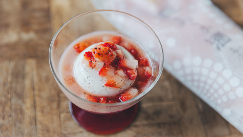 爽やかミルクプリンの甘酒スープ仕立て、イチゴのマリネをのせて